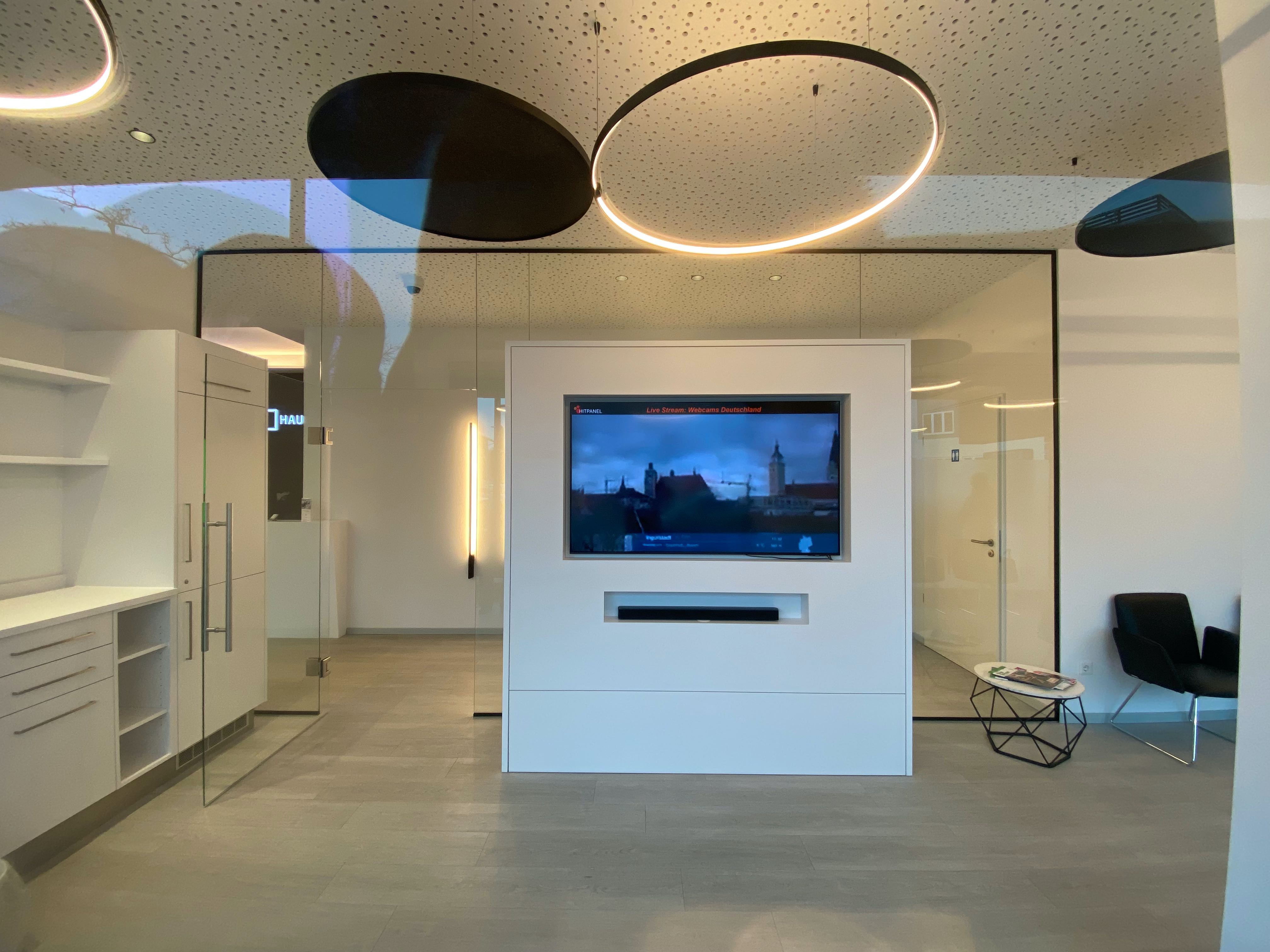 Empfangsbereich, zwei Wartebereiche, drei Sprechzimmer, ein Labor, ein Diagnostikraum (EKG und Sonografie).