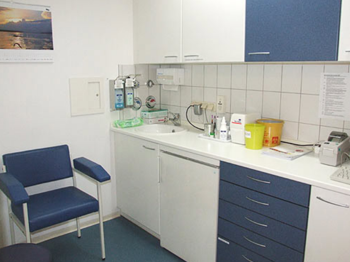 Praxiseingang im 1. Stock, mit Lift. Freundlicher Empfang, Praxilabor, Ultraschallzimmer, zwei Sprechzimmer, Wartebereich.