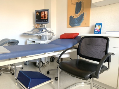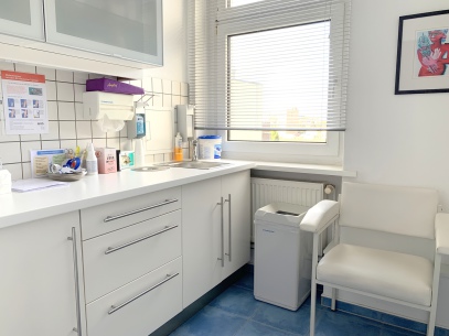 Die Praxisräume umfassen in rund 160 qm neben dem großzügigen Tresen mit angrenzendem Warteraum 2 Behandlungsräume, Sprechzimmer, CTG/Hebammen-Zimmer, Labor, Personalraum, zwei Toiletten und einen Archivraum im Dachgeschoß des Mietshauses.